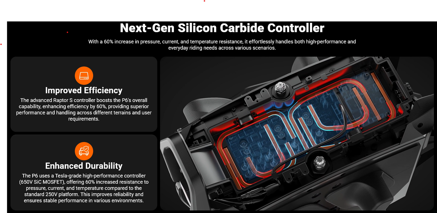 Uses a next-generation silicon carbide (SiC) controller (650 V SiC MOSFET) with ~60% increase in pressure, current, and temperature resistance compared to standard lower-voltage platforms.