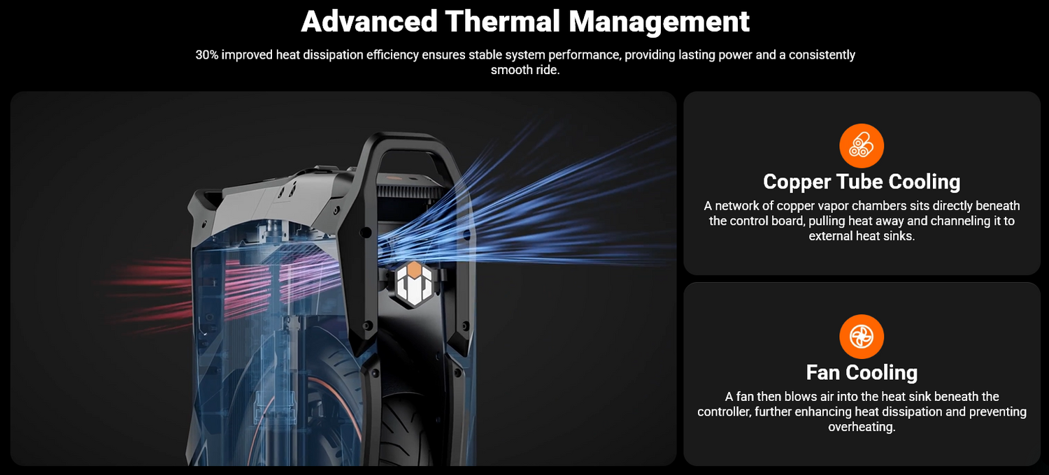 Advanced cooling: network of copper vapor chambers plus external heat sinks, and active fan cooling to manage controller and battery heat. Claimed “30% improved heat dissipation efficiency.”