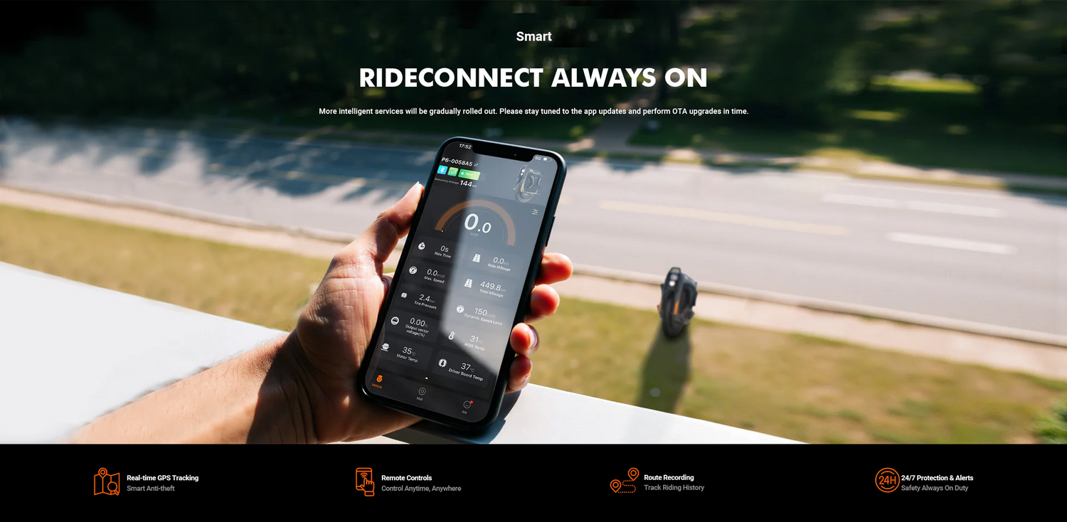 INMOTION IoT System: real-time GPS tracking, anti-theft features, remote control, ride history & route recording, alerts, continuous firmware/OTA updates.