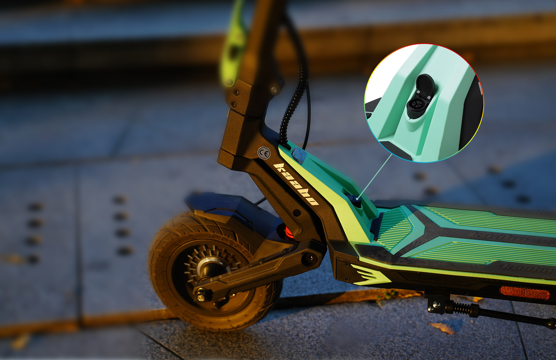 The Kaabo Urban features a rebound charging port design that protects against dust, moisture, and debris, ensuring long-lasting cleanliness and functionality. Additionally, the charging port meets the latest IEC60335 certification standards, enhancing the product's compliance and reliability.