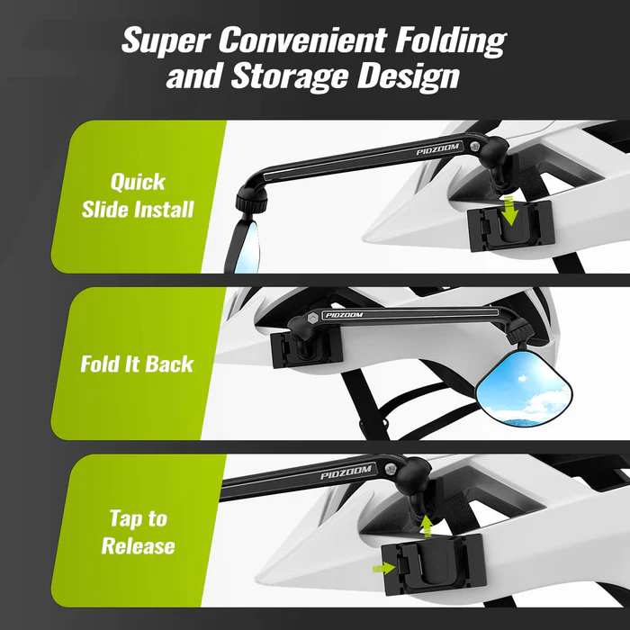 PIDZOOM helmet mirror has been collaboratively designed with input from the global personal electric vehicle community. It is compatible with a variety of helmet styles and aims to improve safety by enhancing situational awareness.