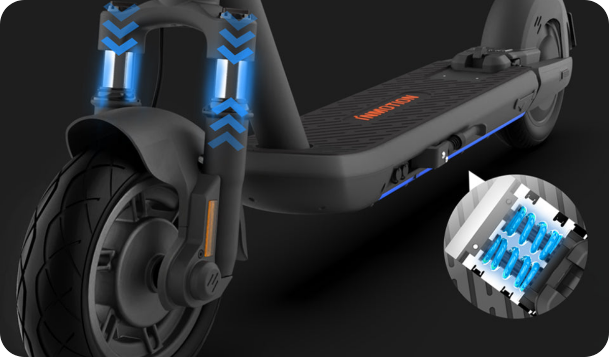The INMOTION S1F is equipped with a dual shock absorption system, enhancing ride comfort across various terrains.