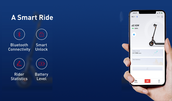 The KQi 300X connects to your smartphone. Use the NIU app to switch between modes to estimate range, record rides, check battery life, lock/unlock the scooter, and more.