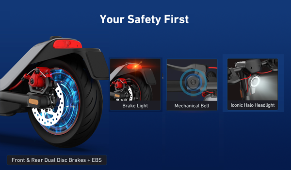 Front and rear dual-action disc brakes & EBS, build-in brake light and iconic hallo light provide superior stopping power, while regenerative braking provides additional power at no cost.