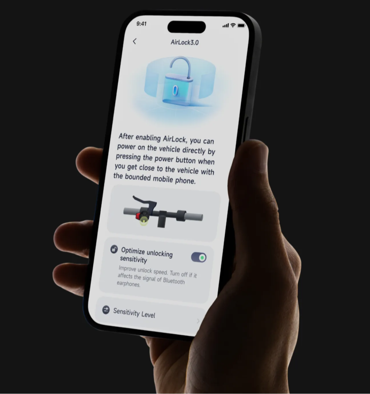 Autonomous UnlockingThe AirLock technology enables the ekickscooter to pair with a smartphone, allowing riders to unlock the ekickscooter without the need for physical keys or key fobs. When the rider approaches the vehicle, the ekickscooter recognizes the connected device and unlocks the vehicle seamlessly, often via a designated app or a simple tap of a button, offering a convenient and secure start to their ride.