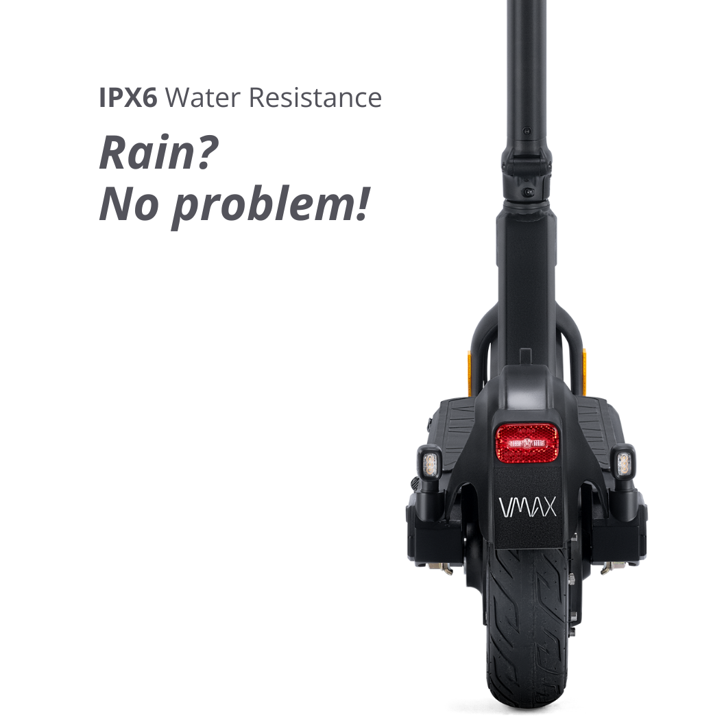 The powerful motor, with a peak output of 1600W, guarantees robust acceleration and an impressive 33% climbing ability, marking the pinnacle of performance. The widened footboard offers extra foot clearance and comfort, while bright front and rear indicator lights ensure optimal visibility in traffic. With an increased maximum load capacity of 330 lbs, the VX2 Extreme is built to accommodate just about every rider. The newly designed one-piece rear mudguard not only adds a modern touch but also protects against splash water and dirt. Boasting a range of up to 50 km, the VMAX VX2 Extreme is perfect for longer rides, leaving nothing to be desired.