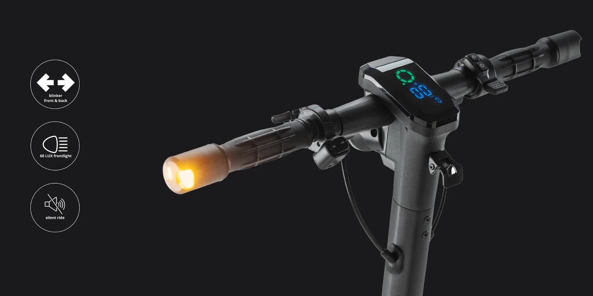Equipped with a top-tier indicator system at both the front handlebars and rear mudguard, the VX2 PRO maximizes your safety when signaling turns in road traffic. The design includes extended handlebars, making sure the front indicators are visible from behind and not blocked by the rider.